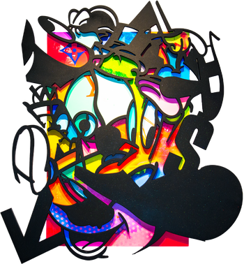 Acrylic, spraypaint, wood cut out on wood panel